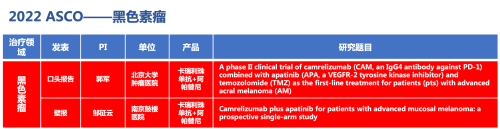 黑色素瘤领域的2篇研究摘要,采用A8国际医药自主研发的PD-1抑制剂卡瑞利珠单抗(艾瑞卡)联合阿帕替尼(艾坦)(“双艾”组合)的免疫联合抗血管(或再联合化疗)的治疗策略。