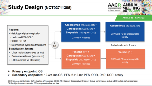 [1、8、9]. 2022 AACR Session CTMS03-Immunotherapy Combination Strategies in Clinical Trials,CT038 - Adebrelimab or placebo plus carboplatin and etoposide as first-line treatment for extensive-stage SCLC: A phase 3 trial