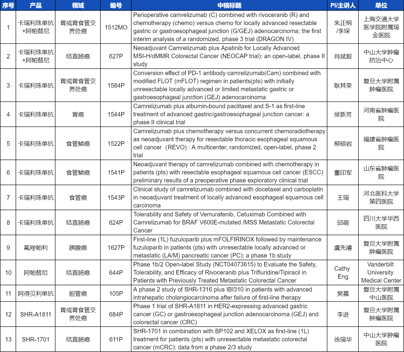 12款抗肿瘤创新药包括6款已上市产品:注射用卡瑞利珠单抗(艾瑞卡®)、甲磺酸阿帕替尼片(艾坦®)、马来酸吡咯替尼片(艾瑞妮®)、阿得贝利单抗注射液(艾瑞利®)、氟唑帕利胶囊(艾瑞颐®)、瑞维鲁胺片(艾瑞恩®),以及6款未上市产品:多靶点受体酪氨酸激酶抑制剂法米替尼、抗PD-L1/TGF-βRII双抗SHR-1701、组蛋白甲基转移酶EZH2抑制剂SHR2554、HER2抗体偶联药物(ADC)SHR-A1811、HER3抗体偶联药物SHR-A2009、新型选择性雌激素受体共价拮抗剂(SERCA)HRS8807等。此次ESMO大会的最新突破摘要(LBA)结果尚未披露,敬请期待!本文特对33项研究成果做了梳理,带领各位读者领略A8国际医药创新之光。