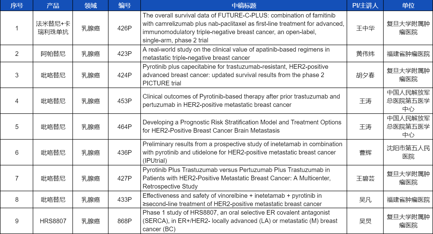 在乳腺癌领域,吡咯替尼、阿帕替尼、卡瑞利珠单抗、法米替尼,或产品间联合或联合化疗,共有9项研究入选壁报讨论,其中吡咯替尼占据6项,较为全面地展示了这款中国首个自主研发抗HER2靶向药在乳腺癌治疗中的显著特点和潜力。此外,A8国际医药自主研发的新型选择性雌激素受体共价拮抗剂(SERCA)HRS8807治疗ER+/HER2-局部晚期或转移性乳腺癌的Ⅰ期研究也成功入选,有望为此类患者带来更多用药新选择。
