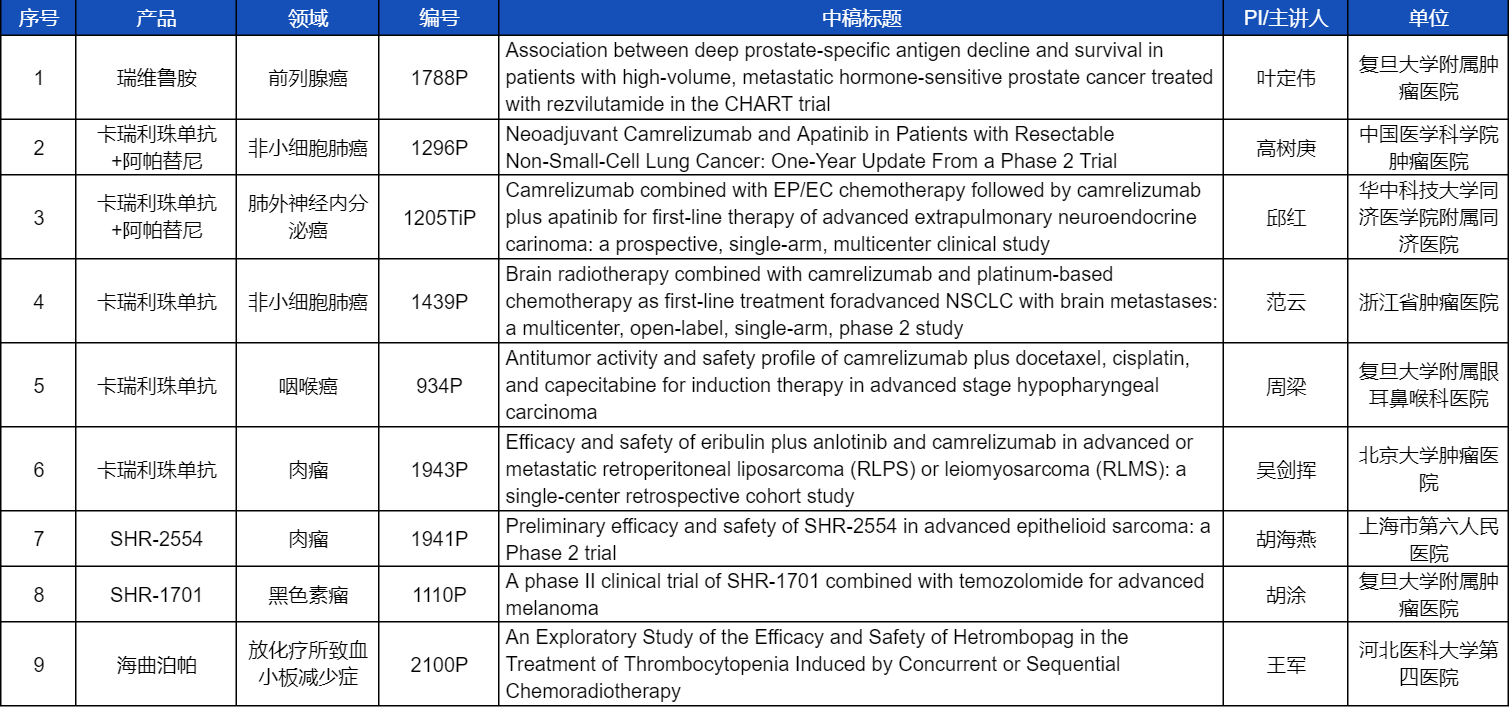 在非小细胞肺癌、咽喉癌、肉瘤、前列腺癌、黑色素瘤等多个领域,卡瑞利珠单抗、阿帕替尼、瑞维鲁胺、SHR-1701、SHR2554等创新产品相关研究一共入选了8项壁报展示。此外,A8国际医药自主研发的血小板生成素受体激动剂(TPO-RA)海曲泊帕在放化疗所致血小板减少领域的探索性研究显示良好的疗效,入选壁报展示。